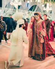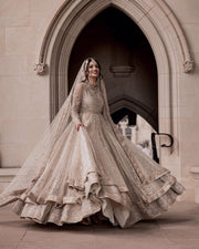An ethereal ivory tulle pishwas featuring a double-layered flare, intricately hand-worked with dabka, zardozi, and hand-cut sitara. Every inch of this ensemble is crafted with meticulous care, reflecting the love, dedication, and countless hours of craftsmanship poured into its creation. A timeless masterpiece for those who value traditional artistry.