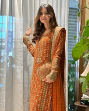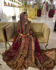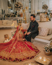 The meticulously selected unique shade of scarlet is the bridal color of the season. The voluminous straight shirt that has a wide heavily embellished daaman comes with high slits and ultimately makes it the most flattering silhouette for a bride. The pure cotton net shirt is beautifully embellished with intricate gold zardozi, dabka, sequins, and silver zari, naqshi, gota. Heavy on the traditional mukesh and kamdani this look is truly the one that will stand out this season. It has a heavy floral trellis on the front and back which gives the bride regal feels. This elegant shirt is complemented with a farshi lengha made in gold jamawar with heavily worked shades of royal pure raw silk for the goth.