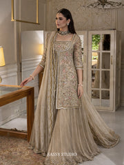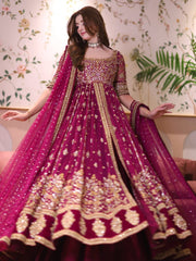 Introducing latest bridal arrival from Haris Shakeel, a timeless masterpiece in deep maroon, richly adorned with intricate gold embellishments and traditional craftsmanship. This regal ensemble captures the essence of old-world charm blended with contemporary finesse, making it a perfect choice for brides who want to embrace heritage while looking effortlessly graceful. From the luxurious fabric to the exquisite handwork, every detail speaks of elegance and royalty.