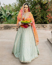 Marked with refined elegance, Rosabella is an ethereal canvas of craft. Cut from sea green opulent silk, the lehnga features a majestic floral print elevated with resham and zari adornments. Paired with a silk blouse and a delicately embellished net dupatta, this set will shine a spotlight on you at every occasion. Color : Sea Green