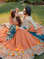 Mehndi Bridal is a beautiful two toned mustard bridal lehnga choli crafted on a raw silk base. It is heavily hand embellished and composed with our signature jewel motifs with stone work, gotta, dabka and crystals. It comes with a heavy jaal dupatta with accents of pearl and gotta and framed with a hand rendered border. It is paired with a digitally printed zari organza dupatta finished with kiran