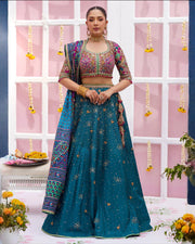 Color: Blue Fabric: Pure Raw Silk Work Details: Embroidered and Embellished A kaleidoscope of jewel tones, with no shortage of bold details. A stunning lehnga choli that we are absolutely obsessed with. A show stopping vibrant blue hue in pure raw silk, giving you the best fall as well as ample volume for that perfect twirl. The exclusively hand block printed fabric is adorned with an array of delicate hand embroidery all over. The richly hand worked choli that we can’t get our eyes off, has unimaginable detailing from the ultra-flattering flared silhouette to the cut work back (that can be customized in a less revealing fashion). The fully hand embellished lengha, with stunning hangings will absolutely make the moment. Laden with heavy sequins and lavishly hand worked borders, the striking charmeuse dupatta with the signature FTA block print. completes this bridal ensemble with undeniable glamour. A stand apart look for any festive event.